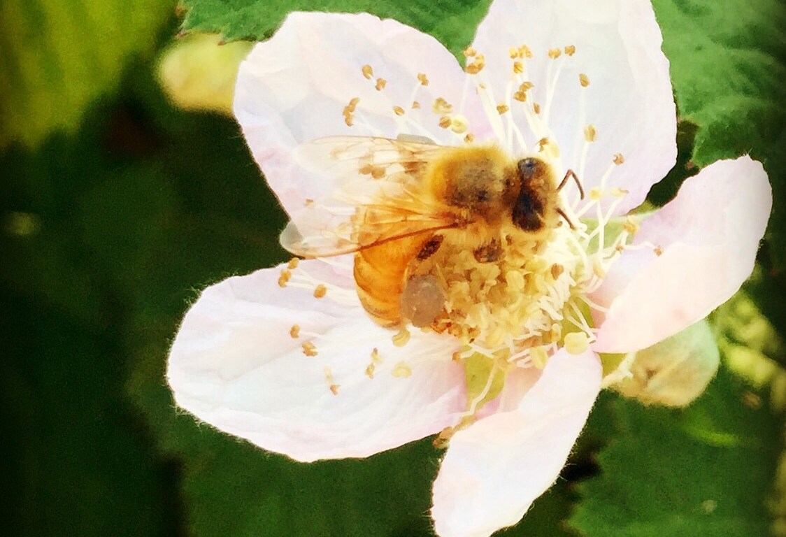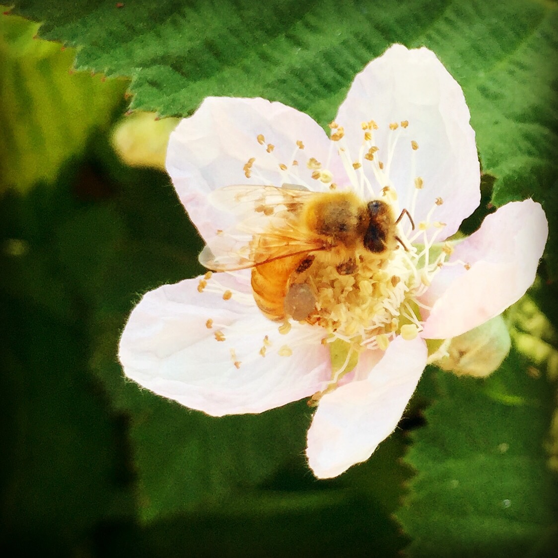 All of my walks and runs around the neighborhood have become bee-scouting adventures, and I like discovering where they may be. It won’t be a mystery where they are for the next few weeks; there are acres of blooming blackberries less than a half-mile from our house, and I spotted a lot of ladies there today. It makes my heart sing!